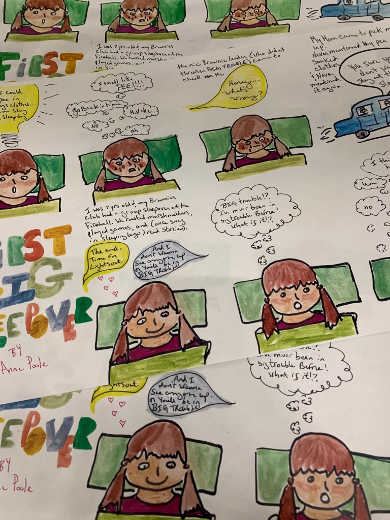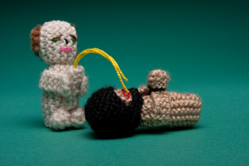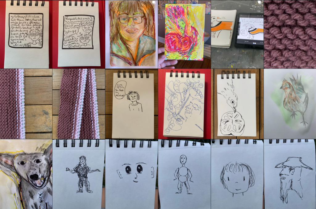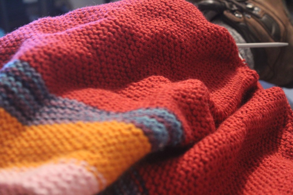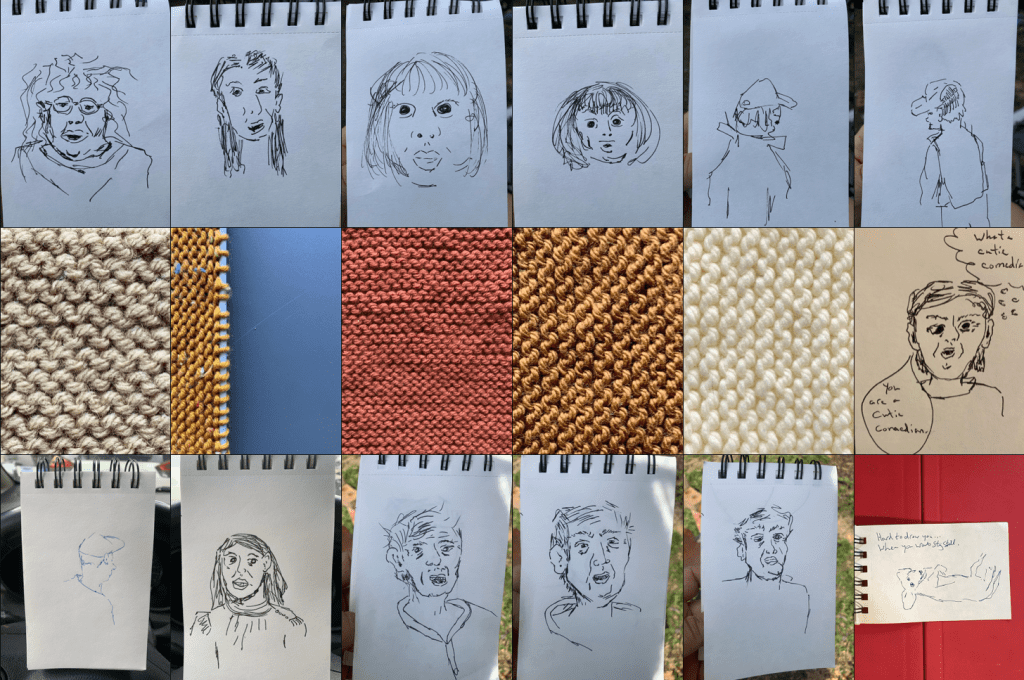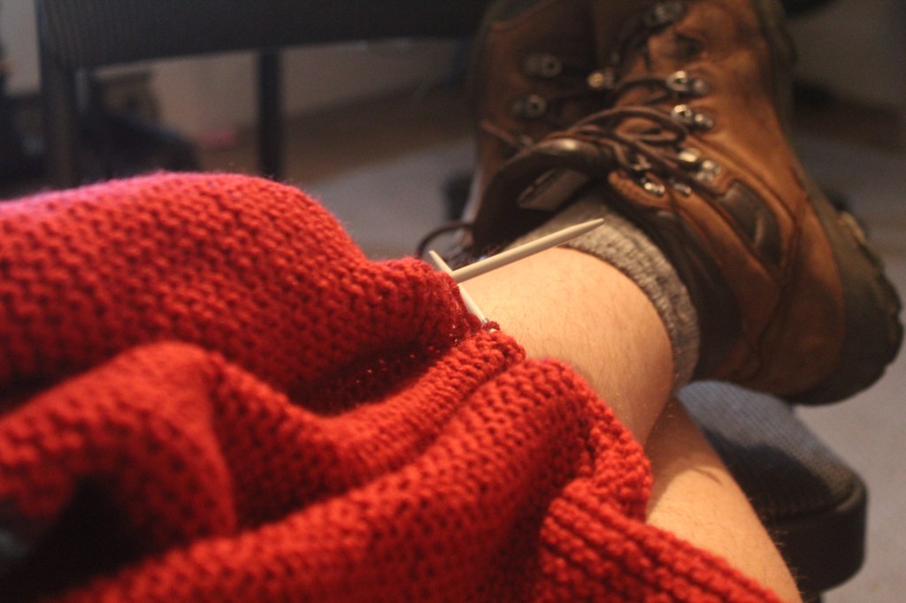 Mostly, I write stories that are meant to be listened to live with a group of people. Sometimes I make another kind of other thing (music, buttons, finger puppets, videos, zines, etc.) that I hope would compliment those stories. Currently, that kind of other thing, that is meant to complement those stories, is knitting.